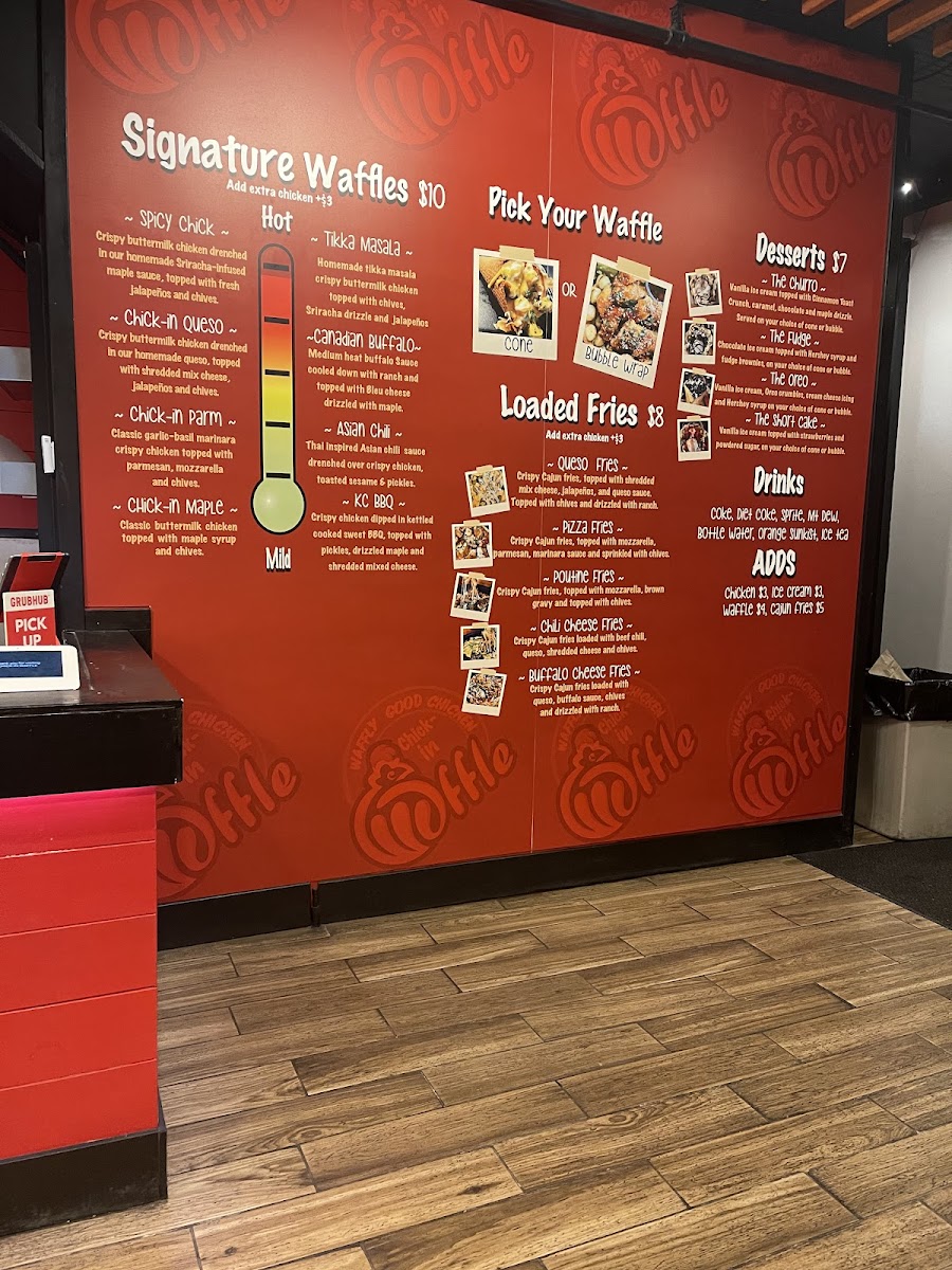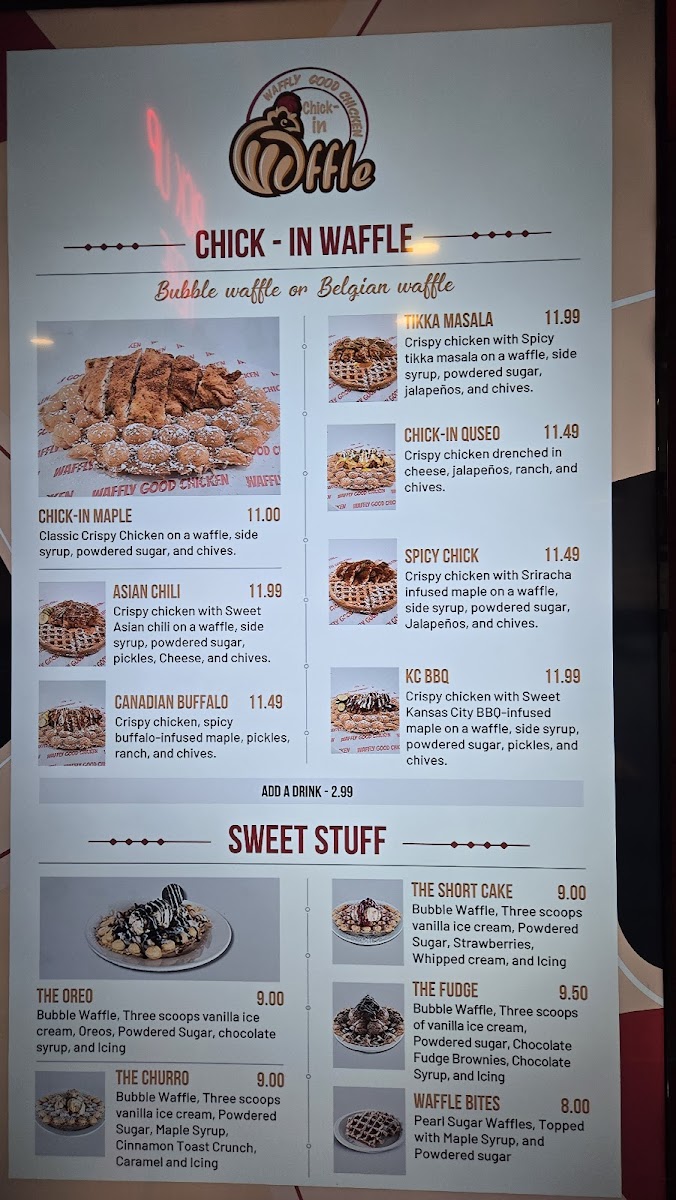 Thai-inspired Asian chili sauce drenched over crispy chicken, toasted sesame, and chives on a delicious waffle.
