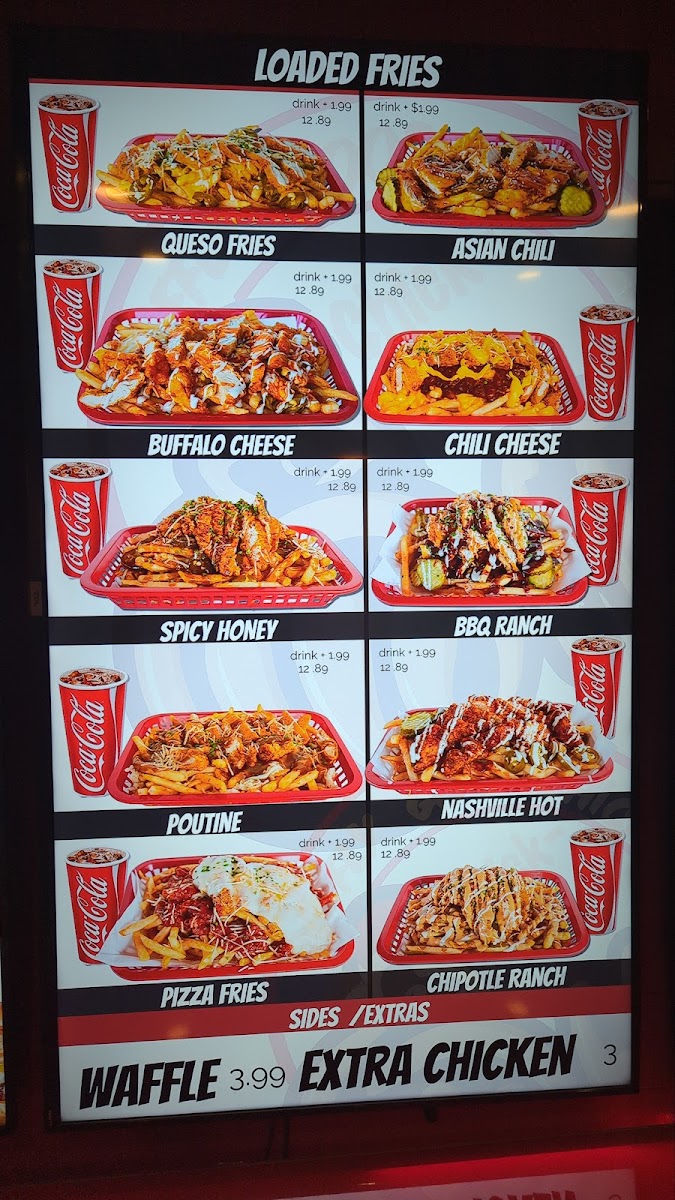 Crispy seasoned fries drizzled with our spicy honey garlic sauce, cheddar cheese, jalapeños, chives, and our crispy chicken.