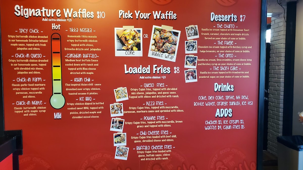Crispy buttermilk chicken and fresh chopped tomato and onion drenched in spicy tomato and cream sauce on a delicious waffle.